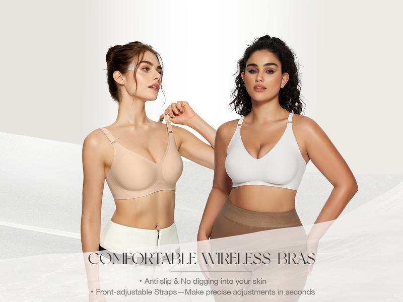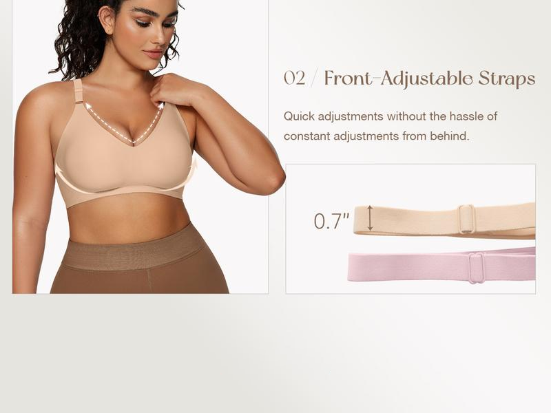 Super Soft and Comfortable Fabric: 55%nylon and 45% spandex.This bra uses buttery smooth fabric feels like wearing a cloud, breathable features wick away sweat and moisture to keep you dry all day longJelly Strip Technology: 3D Stretch and total seamless appearance makes this full coverage bra for women perfectly fits your body shape, V-neck design better shows off your curvesWirefree.